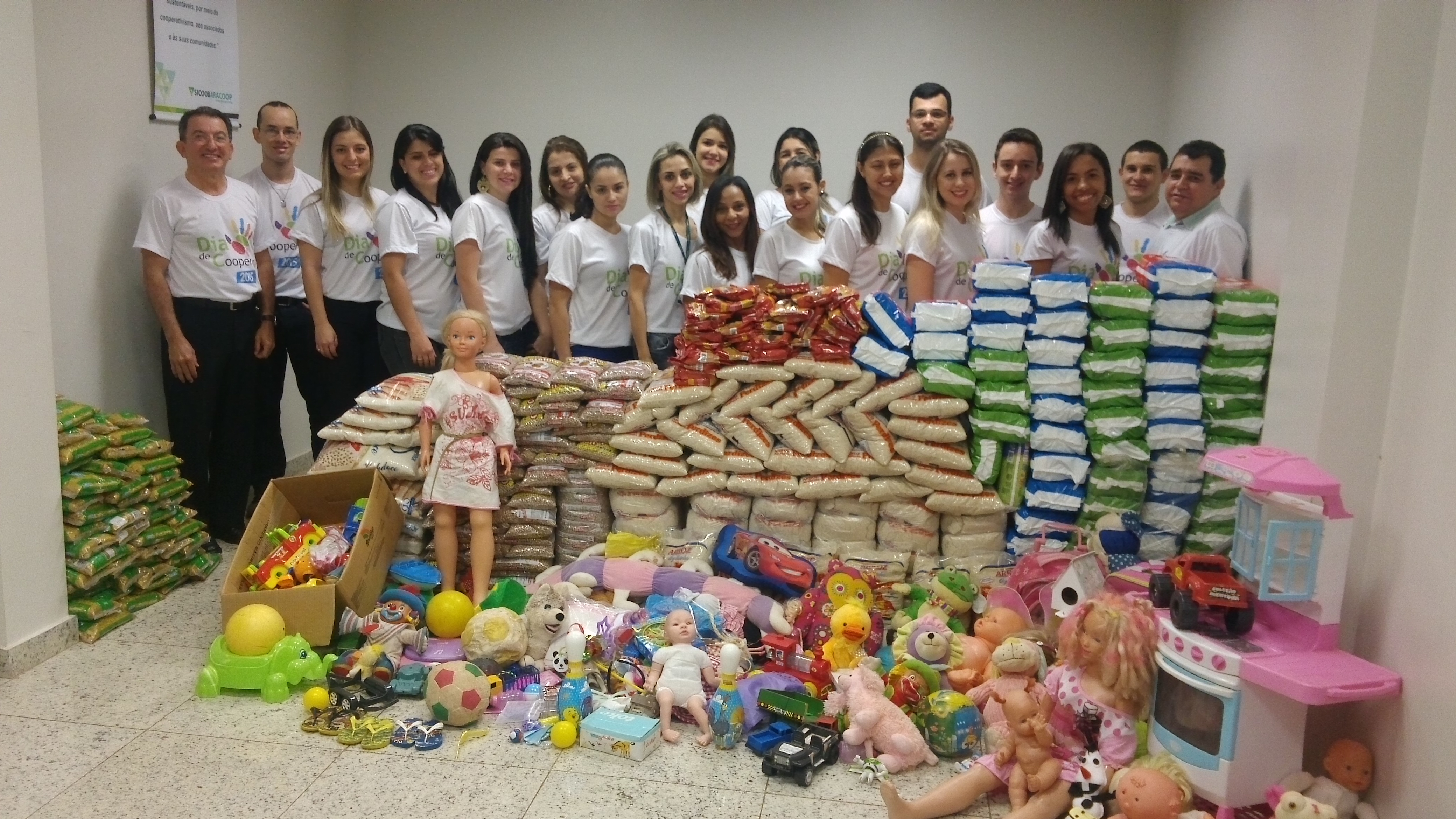 Em Monte Carmelo, além de agasalhos, foi montado um empório dentro do Posto de Atendimento do Sicoob Aracoop para estimular a comunidade a fazer doações para a creche Carmoceb. Os voluntários também contribuíram com uma tonelada de alimentos, 1.520 fraldas descartáveis e brinquedos.